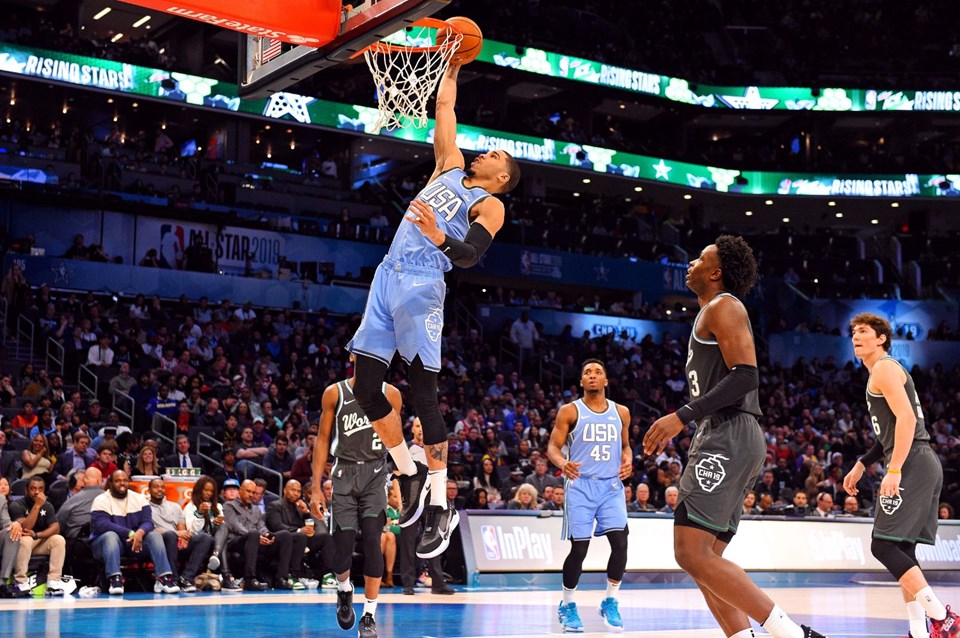 NBA takımlarından Charlotte Hornets'ın sahası Spectrum Center'ın ev sahipliği yaptığı organizasyonun "Yükselen Yıldızlar" müsabakasında, ABD karması ile dünya karması karşılaştı.