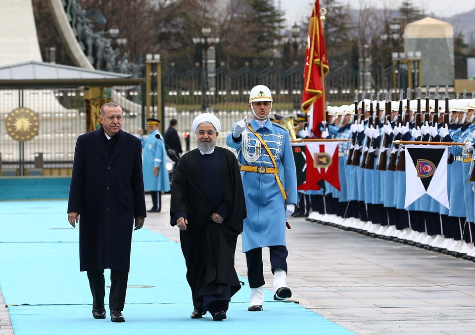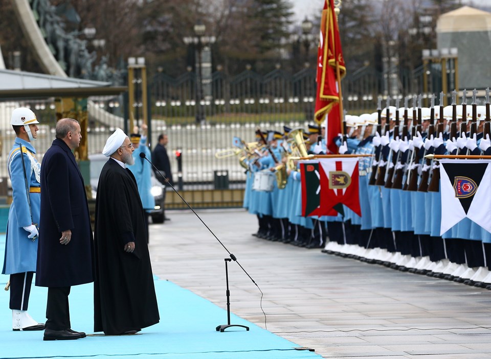 Erdoğan ve Ruhani'nin, tören alanındaki yerlerini almalarının ardından iki ülkenin milli marşları çalındı, 21 pare top atışı yapıldı.