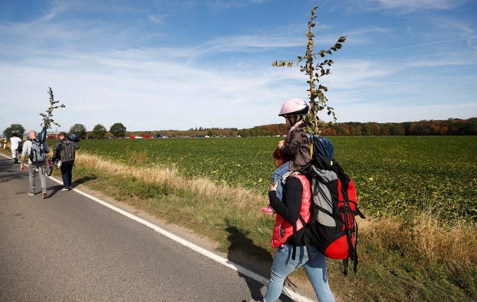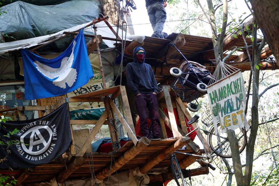 Yaklaşık 12 bin yıllık tarihe sahip Hambach Ormanı'nda bulunan asırlık meşe ve kayın ağaçlarının yüzde 90'ının linyit madeni çıkarmak için kesildiğini belirten çevreciler, kalan ağaçları korumak için mücadele veriyor.