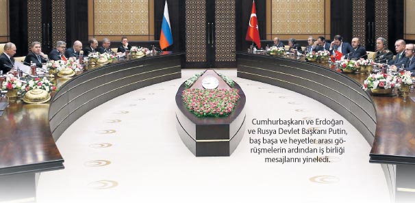 - BU YIL İÇİNDE 8. GÖRÜŞME: Değerli dostum Sayın Putin ve heyetini yeniden ülkemizde ağırlamaktan büyük memnuniyet duyuyorum. Bu yıl içinde değerli dostum Putin ile sekizinci kez bir araya geliyoruz. Bu yakın diyalog ikili ilişkilerimizin ve bölgesel konulara ilişkin teşriki mesaimizin boyutlarını açıkça ortaya koyuyor. Türkiye-Rusya işbirliği her geçen gün daha da güçleniyor. Siyasi düzeyde ahenkli bir çalışma ortamımız var. Bu ziyaretler ve telefon görüşmelerimiz kritik konuları düzenli olarak değerlendiriyor, ortak bakış açıları geliştirmeye çalışıyoruz. Bu stratejik eşgüdümü önümüzdeki yıl 7. Üst Düzey İşbirliği Konseyi toplantısıyla sürdüreceğiz. Konsey öncesinde ilgili bakanlarımız hazırlık toplantılarını gerçekleştirecek.