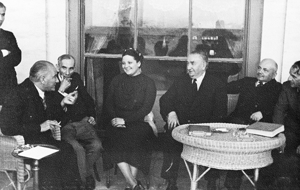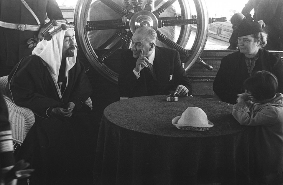6 Haziran 1937 - Ürdün Kralı 1. Abdullah (solda) ile Söğütlü Yatı'nda. Makbule Atadan (sağ 2), Atatürk'ün manevi kızı Ülkü (sağda).