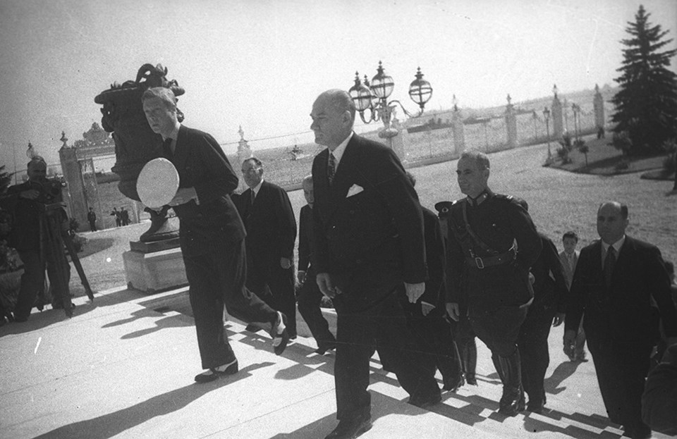 4 Eylül 1936 - Türkiye'ye resmi ziyarette bulunan İngiltere Kralı 8. Edward'ı (önde solda) Dolmabahçe Sarayı'nda karşılarken.