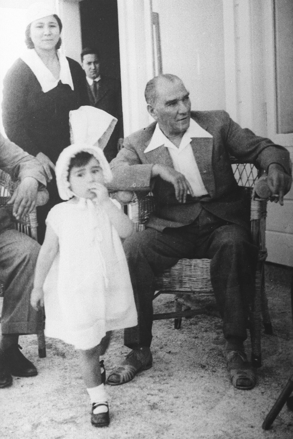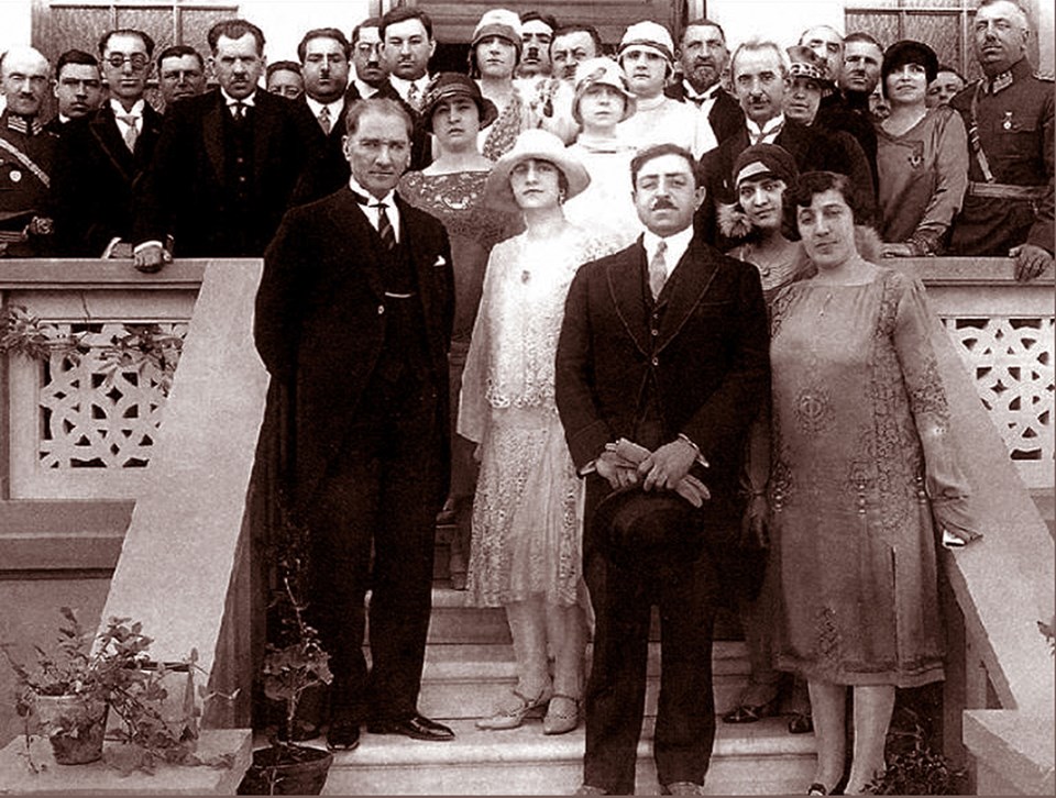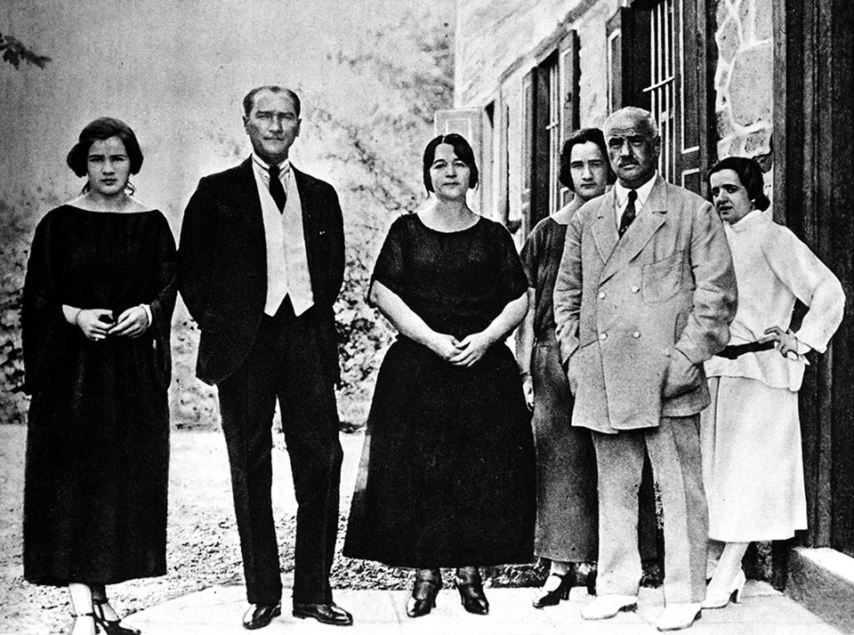 8 Temmuz 1923 - Eşi Latife Hanım'ın (arka sağda), ailesininden baba Ussakızade Muammer Bey (sağda), baldızları Rukiye Hanım (solda), Vecihe Hanım (arka sağ 2) ve kayınvalidesi Adviye Hanım (sol 3) ile birlikte.