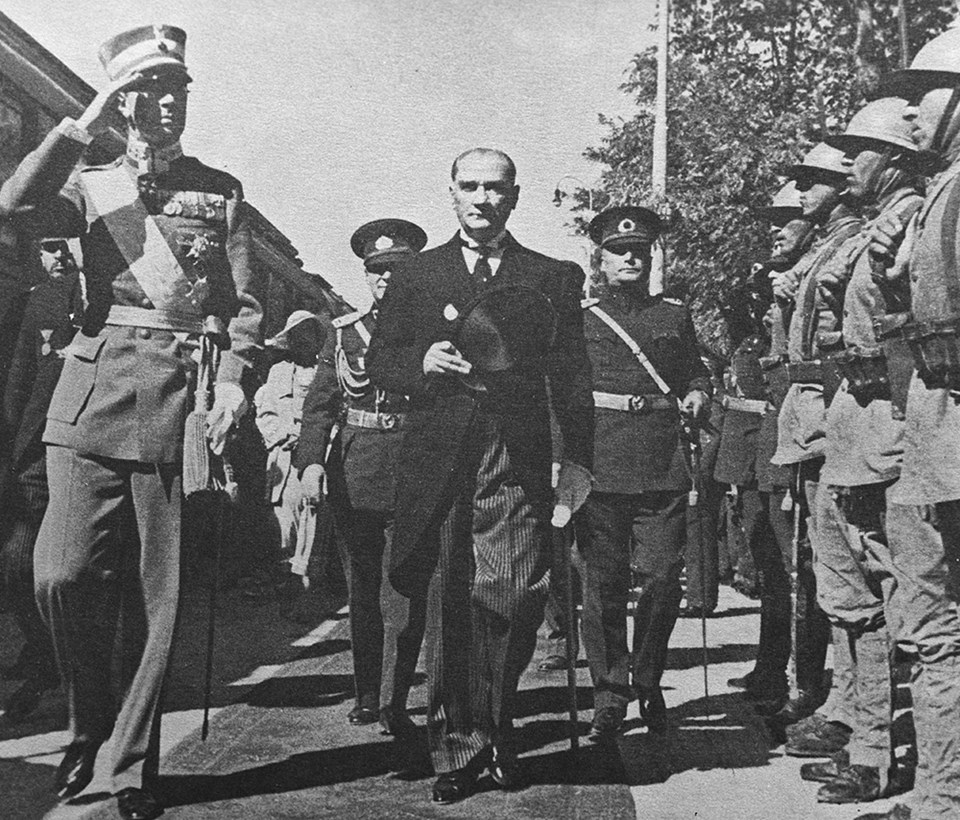 21 Haziran 1934 - Başbakan İsmet İnönü (solda) ve İran Şahı Rıza Pehlevi (ortada) ile birlikte Afyon Orduevi bahçesinde
