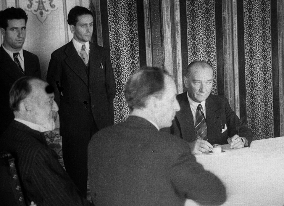 22 Ağustos 1936 - Dolmabahçe Sarayı'nda toplanan 3. Türk Dil Kurultayı'nda şair Abdulhak Hamit Tarhan (solda sakallı) ve Türk Dil Kurumu Genel Sekreteri Necmi Dilmen (sırtı dönük) ile.