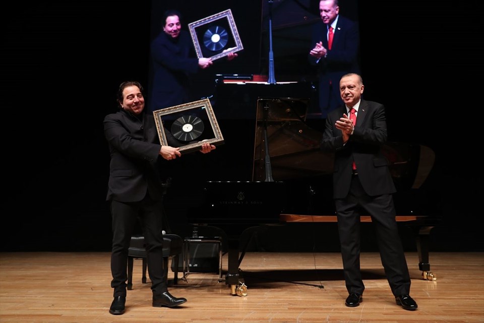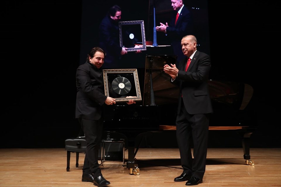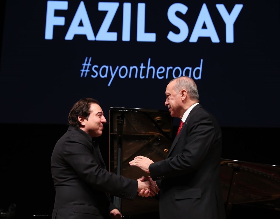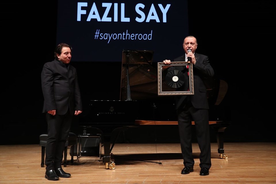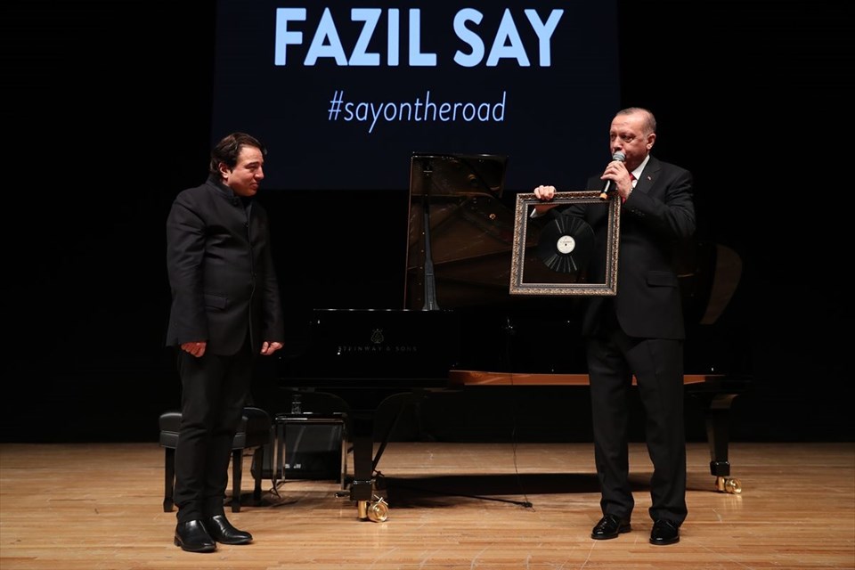 Truva Sonatı ve İzmir Süiti eserlerinden bölümleri yorumlayan Fazıl Say'ı konser sonunda Cumhurbaşkanı Erdoğan, protokol ile birlikte ayakta alkışladı.