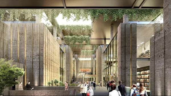 Zemin ve birinci kattan fuayelerin birleşmesi vasıtasıyla birbirlerine ve nihayetinde ana binaya bağlanan alçak yapılardan oluşan bu ikincil üniteler sokak seviyesinde, kolay erişilebilir, bağımsız mekanlardan ibaret olacak.
