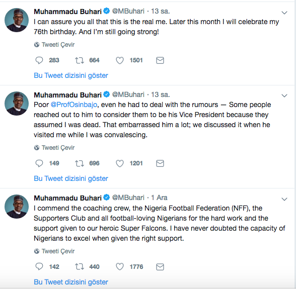Buhari, Twitter hesabından yaptığı paylaşımda öldüğü ve yerine bir klonunun getirildiği yönündeki iddiaları yalanladı. Buhari bu iddialar için 'cahilce dedikodular' dedi.
