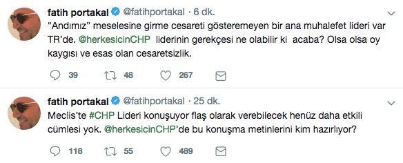 Fatih Portakal, resmi Twitter hesabından şu ifadeleri kullandı; ''Meclis’te CHP Lideri konuşuyor flaş olarak verebilecek henüz daha etkili cümlesi yok. CHP’de bu konuşma metinlerini kim hazırlıyor? “Andımız” meselesine girme cesareti gösteremeyen bir ana muhalefet lideri var TR’de. CHP liderinin gerekçesi ne olabilir ki acaba? Olsa olsa oy kaygısı ve esas olan cesaretsizlik.''