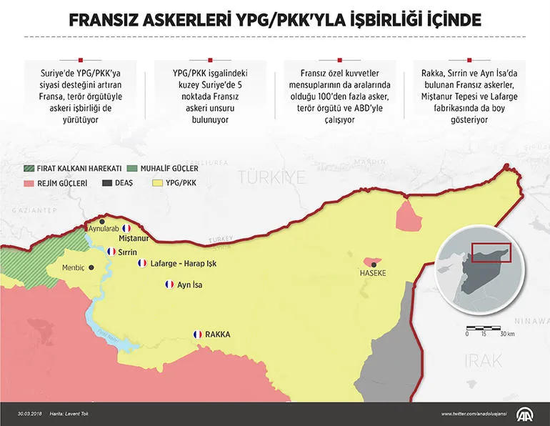 Anadolu Ajansı'nın 30 Mart 2018'de Fransız ordusunun Suriye'nin kuzeyindeki PYD/YPG'nin etkin olduğu bölgede beş askeri üste varlık gösterdiğine dair grafikli haberi, Paris'te tepki yarattı.