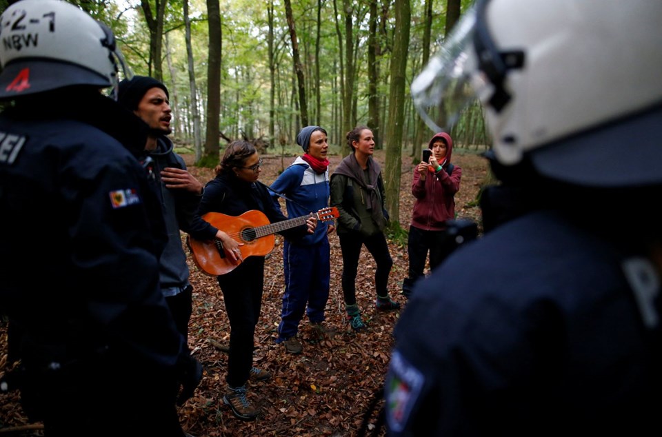 Kuzey Ren Vestfalya eyaletindeki Köln ile Kerpen şehirleri arasında yaklaşık 12 bin yıllık Hambach Ormanı'ndaki alana 51 ağaç ev kuran çevreciler, polise karşı sessiz direnişe geçti.
