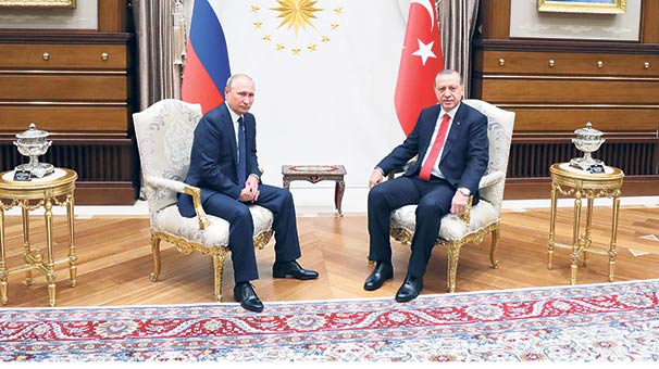 Cumhurbaşkanı Recep Tayyip Erdoğan ile Rusya Devlet Başkanı Vladimir Putin’in dünkü kritik Ankara zirvesinden Irak ve Suriye mutabakatı çıktı. İkili ayrıca başta ticari olmak üzere ikili ilişkileri artırma kararı aldı. Erdoğan dün Putin ve heyetini Cumhurbaşkanlığı Külliyesi’nde ağırladı. İki lider yaklaşık 3 saatlik görüşme gerçekleştirdi. Görüşmelerde Irak ve Suriye başta olmak üzere bölgesel konular ile ticari başta olmak üzere ikili ilişkilerin artırılması ele alındı. Heyetlerarası görüşmelere Genelkurmay Başkanı Orgeneral Hulusi Akar, Başbakan Yardımcısı Mehmet Şimşek, Dışişleri Bakanı Mevlüt Çavuşoğlu, Enerji ve Tabi Kaynaklar Bakanı Berat Albayrak, Ekonomi Bakanı Nihat Zeybekçi, MİT Müsteşarı Hakan Fidan, Savunma Sanayi Müsteşarı İSMAİL DEMİR, Cumhurbaşkanlığı Sözcüsü İbrahim Kalın katıldı. Rus heyetinde ise Rusya Devlet Başkan Yardımcısı Yuri Uşakov, Rusya Genelkurmay Başkanı Valeriy Gerasimov, Dışişleri Bakanı Sergey Lavrov, Enerji Bakanı Aleksandr Novak, Kremlin Sözcüsü Dmitri Peskov yer aldı.