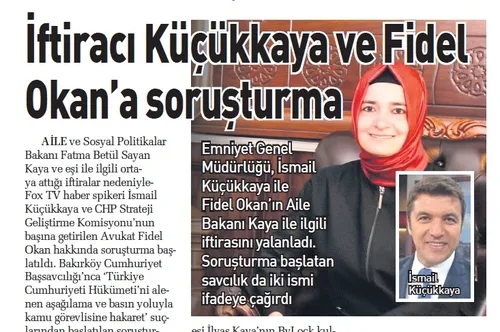 Aile ve Sosyal Politikalar Bakanı Betül Sayan Kaya'ya iftira attıkları gerekçesiyle haklarında 'kamu görevlisine hakaret' ve 'Türkiye Cumhuriyeti Hükümetini alenen aşağılama' suçları kapsamında haklarında dava açılan İsmail Küçükkaya ve Fidel Okan'ın mahkeme ifadeleri ortaya çıktı. Sanık olarak ifadesine başvurulan İsmail Küçükkaya, Fidel Okan'ı tanımadığını iddia etti. Talimatla Ankara'da ifadesi alınan Fidel Okan'ın "Gazete direktörü ve gazete sahibi ile konuşarak haberleştirdi" şeklindeki ifadesine ilişkin söz verilen sanık İsmail Küçükkaya, "Fidel Okan'ı tanımıyorum. Dolayısı ile benim haber kaynağımı bilemez" dedi.