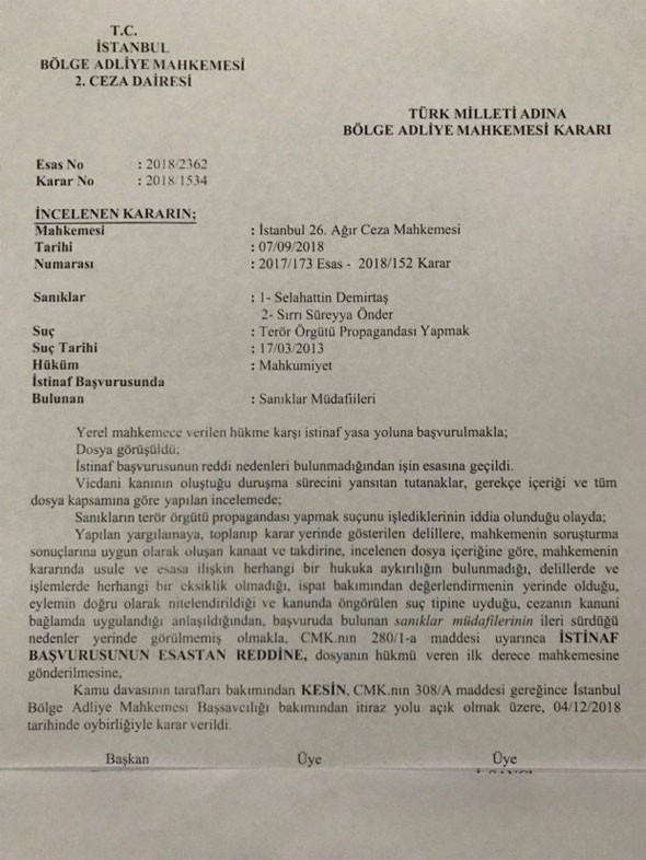 4 YIL 8 AY CEZA ALMIŞTI: Habertürk'ten Veysi İpek'in haberine göre, İstanbul Bölge İdare Mahkemesi, eski HDP Eş Genel Başkanı Selahattin Demirtaş’ın İstanbul 26. Ağır Ceza Mahkemesinde ‘terör örgütü propagandası yapmak’ suçundan verilen 4 yıl 8 hapis cezasını onadı.