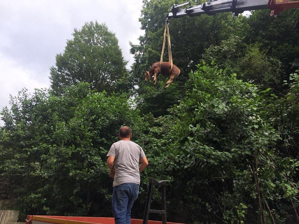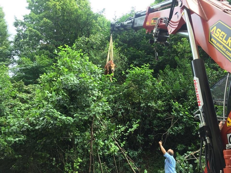 Yaklaşık 600 kilogram ağırlığındaki boğa, forklifte bağlanan iple yukarı çekilerek kurtarıldı.