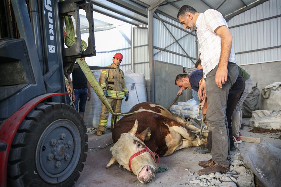 Durumun itfaiye ekiplerine bildirilmesi üzerine, boğayı kurtarmak için çalışma başlatıldı.
