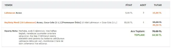 Öğrenciler, henüz bursları yatmadığı için paralarının yetmediğini ileri sürerken, verdikleri siparişin not kısmına, "Merhaba, evde 5 öğrenciyiz. Vize haftası başladı.Neredeyse uyumadan sınavlara çalışıyoruz.Kişi başı 3 lahmacun sipariş edecektik, ama paramız bu kadarına yetti. (Bursun yatmasına daha çok var) Mümkünse, 2 tane de sizin yollamanızı rica ediyoruz" diye yazdı.