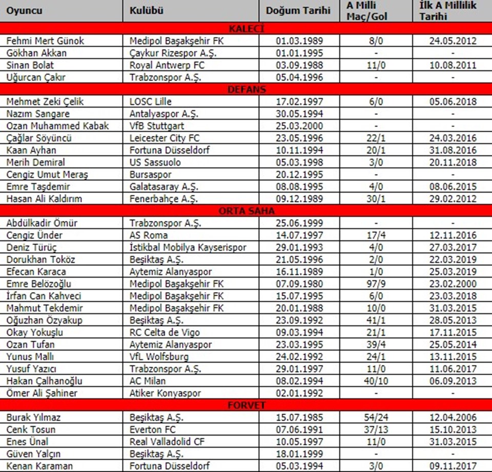 A Milli Takım Teknik Direktörü Şenol Güneş tarafından belirlenen kadroda şu futbolcular yer alıyor: