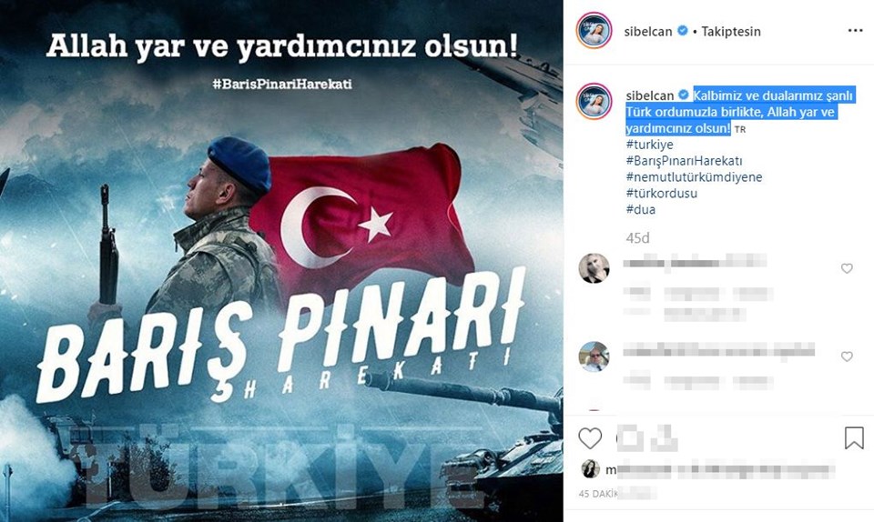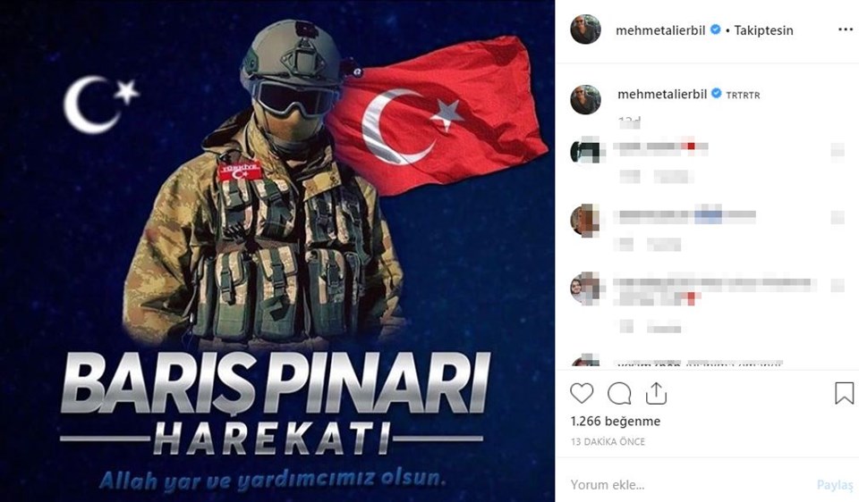 Türkiye'nin güvenli bölge oluşturmak amacıyla Fırat'ın doğusuna yönelik düzenlediği Barış Pınarı Harekatı başladı. Sanattan spora, televizyondan podyuma, gösteri dünyasının ünlü isimleri sosyal medya hesaplarından Mehmetçik'e destek mesajları paylaştı...