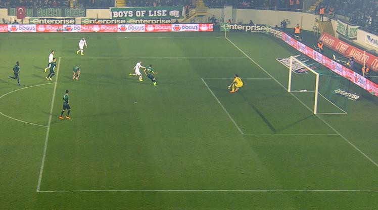 54. dakikada sağ kanattan Vrsajevic’in yerden ortasında ceza sahası içinde topla buluşan Serginho’nun kaleyi cepheden gören noktadan sert şutunda meşin yuvarlak direğin yanından dışarıya çıktı.