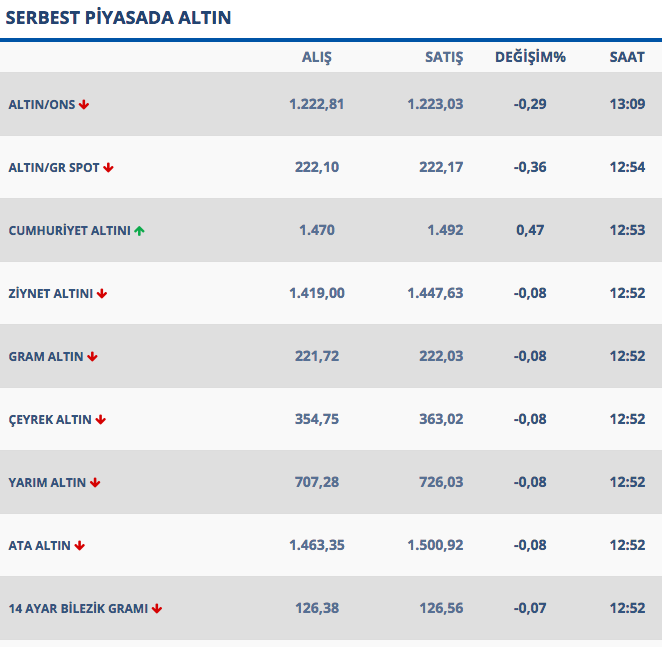 Altın fiyatları ne kadar? : Gram altın yeni haftaya 222 lira satış fiyatı ile başladı. Çeyrek altın da 363 liradan kapalıçarşıda alıcı buldu. İşte altın fiyatlarındaki son durum: