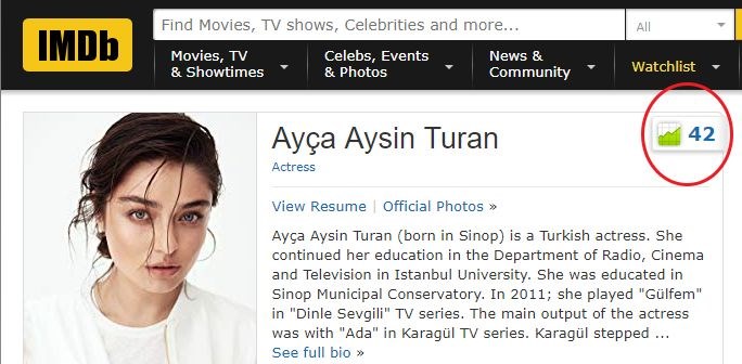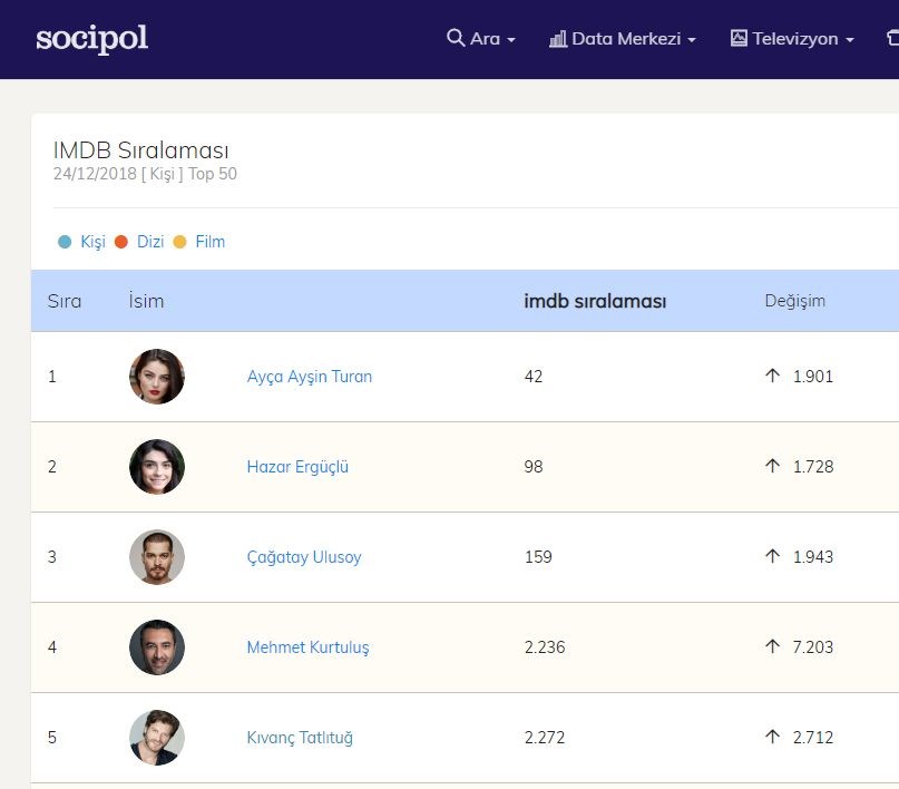 IMDb listelerinin daimi birincisi Kıvanç Tatlıtuğ, 2272’inci olarak Türk oyuncular içinde 5. sırada yer aldı. Listenin her zaman ilk 3’ü içinde görmeye alışık olduğumuz Haluk Bilginer 9, Belçim Bilgin globalde ilk 10.000 isim arasında olmasına rağmen Türk oyuncular içinde 16’ıncı olabildi.