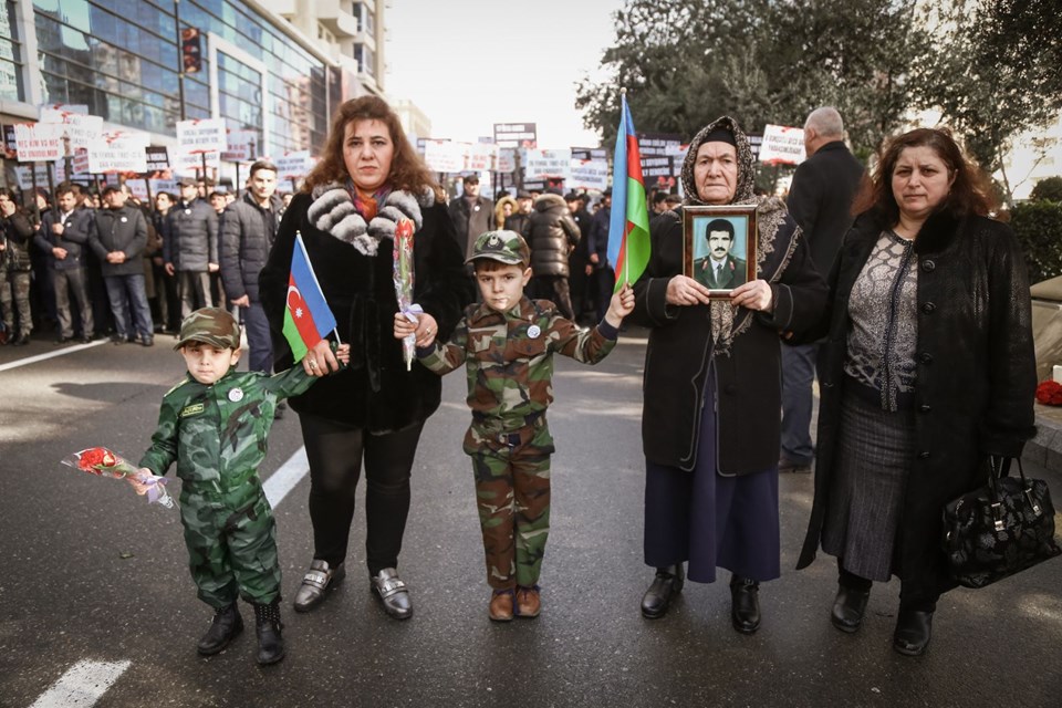 Ellerinde Azerbaycan bayrakları, katledilenlerin fotoğrafları ve Ermeni zulmüne tepkilerin yazıldığı dövizlerle anıta gelen Azerbaycanlılar, hayatını kaybedenlerin anısına karanfiller bıraktı.