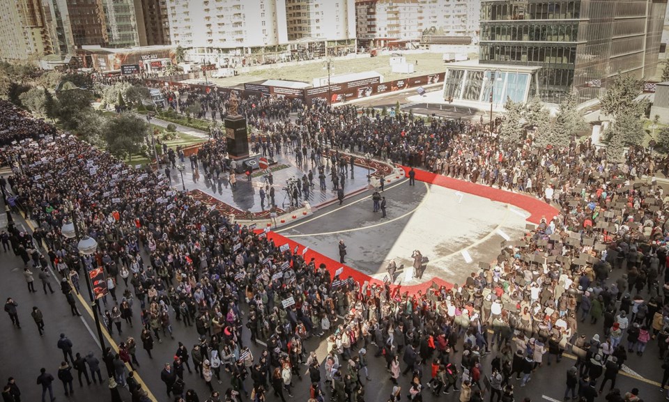 Azadlık Meydanı'nda toplanan on binlerce Azerbaycanlı, Cumhurbaşkanı İlham Aliyev ve devlet erkanıyla Ana Feryadı Anıtı'na yürüdü.