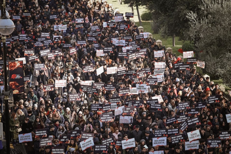 zerbaycan'da, Ermenilerin 26 Şubat 1992'de yaptığı Hocalı Katliamı'nın kurbanları, on binlerce kişinin katılımıyla anılıyor.