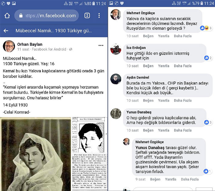 16 YAŞINDAKİ TÜRKİYE GÜZELİNİ... Orhan Baylan, “Mübeccel Namık.. 1930 Türkiye güzeli. Yaş: 16. Kemal bu kızı Yalova kaplıcalarına götürdü orada 3 gün beraber kaldılar. Kemal işleri arasında kaçamak yapmaya her zaman fırsat bulurdu. Türkiye'de kimse Kemal'in bu fuhşiyatını sorgulamaz. Onu hatasız bilirler” dedi. Bu paylaşımın altına da, Atatürk'e yönelik birbirinden çirkin yorumlar yapıldı.