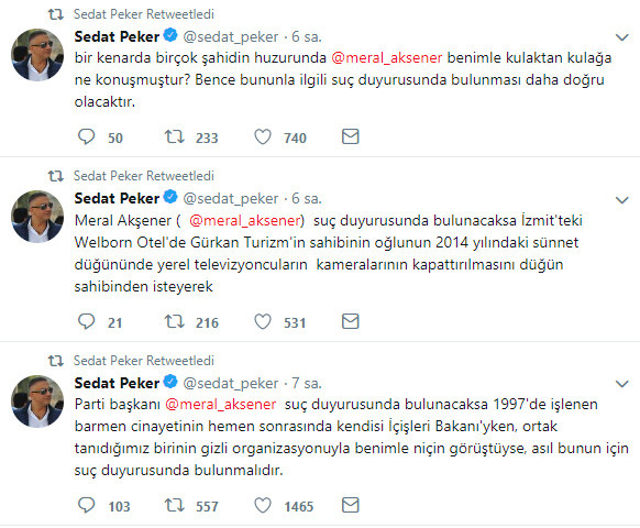 Peker paylaşımlarının devamında “Meral Akşener suç duyurusunda bulunacaksa İzmit'teki Welborn Otel'de Gürkan Turizm'in sahibinin oğlunun 2014 yılındaki sünnet düğününde yerel televizyoncuların kameralarının kapattırılmasını düğün sahibinden isteyerek bir kenarda birçok şahidin huzurunda benimle kulaktan kulağa ne konuşmuştur? Bence bununla ilgili suç duyurusunda bulunması daha doğru olacaktır” ifadelerini kullandı.