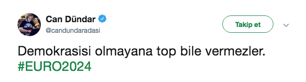 Yaşantısına Almanya'da devam eden gazeteci Can Dündar, resmi Twitter hesabından yaptığı paylaşımda şu ifadeyi kullandı; Demokrasisi olmayana top bile vermezler.