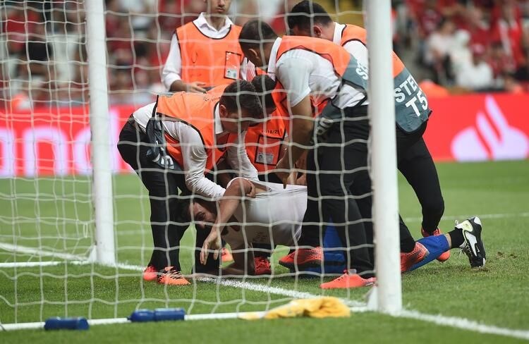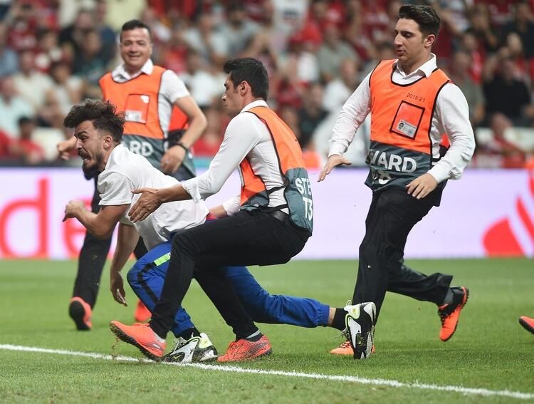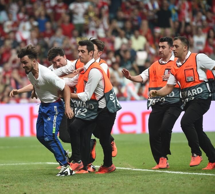 Liverpool ile Chelsea arasında oynanan UEFA Süper Kupa finalinin 14. dakikasında sahaya taraftar atladı.